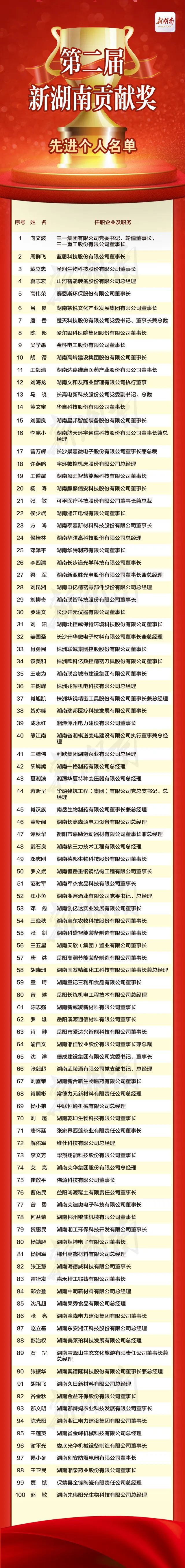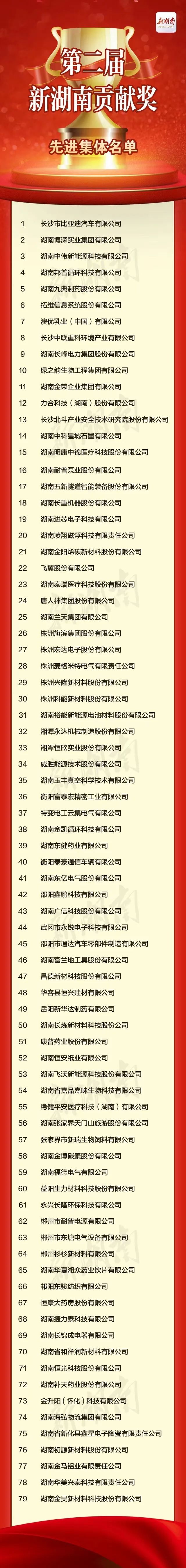 12月25日上午,第二屆新湖南貢獻獎和2023三湘民營企業百強榜新聞發布會在長沙召開。會上,副省長秦國文發布了《關于表彰第二屆新湖南貢獻獎先進集體和先進個人的決定》。為表彰民營企業中的先進集體和先進個人,彰顯“選一個典型,樹一面旗幟”的鮮明導向,營造崇尚先進、學習先進、爭當先進、趕超先進的濃厚氛圍,省委、省人民政府決定,授予湖南裕能新能源電池材料股份有限公司等79家民營企業“新湖南貢獻獎先進集體”稱號;授予向文波等100名民營企業家“新湖南貢獻獎先進個人”稱號。